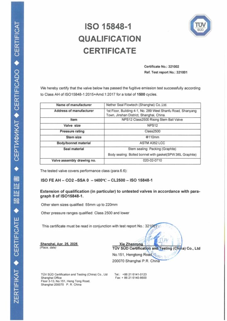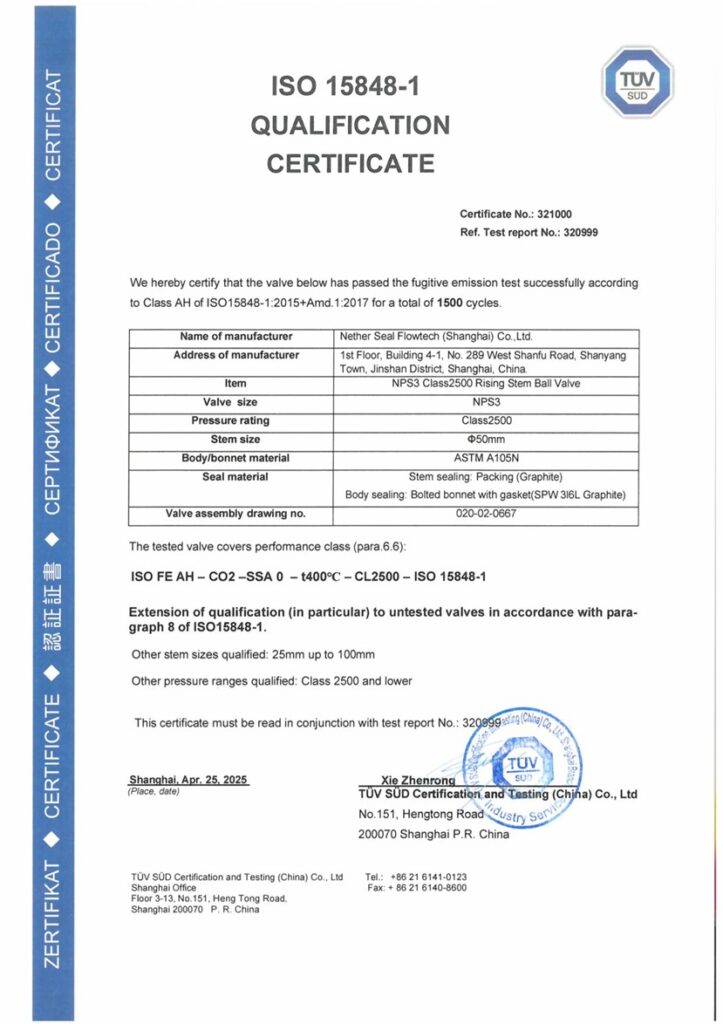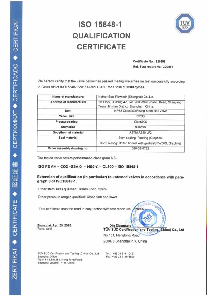 In April 2025, Nether Seal successfully passed the fugitive emission test for RSBV products under the witness of a third party and obtained the ISO15848 certificate issued by TÜV company. This certification marks that Nether Seal has achieved internationally recognized high standards in valve low-leakage performance, signifying further international recognition of its product performance.